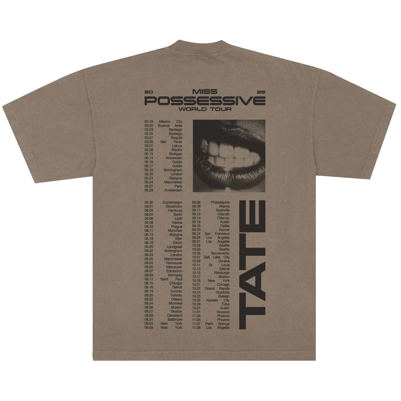 Brown 100% cotton unisex short sleeve tee with Tate Photo on the front and Miss Possessive World Tour stops on the back